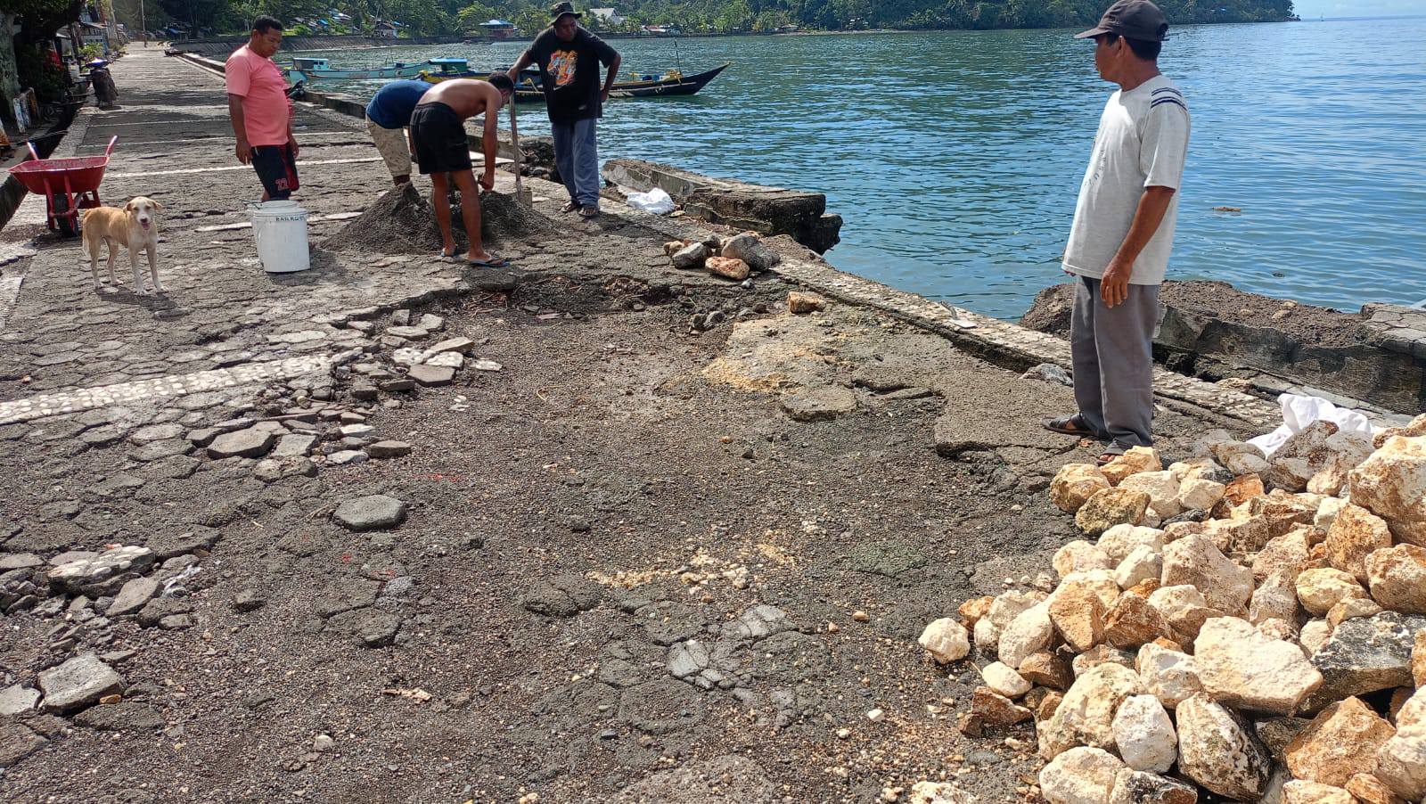 Warga bahu-membahu mengangkut material dan memperbaiki bagian talud yang mengalami kerusakan, demi mencegah dampak lebih luas terhadap pemukiman dan akses warga di sekitar pesisir.