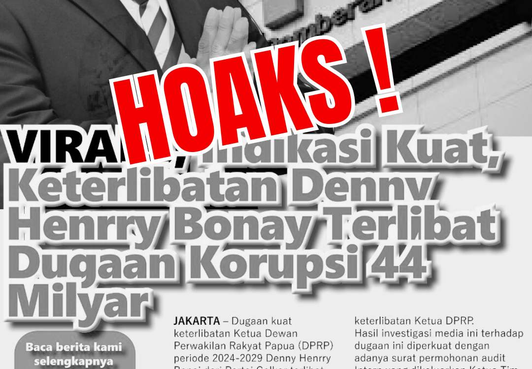 Serui Pos – Beredarnya pemberitaan di salah satu media cetak di Jakarta terkait dugaan korupsi dana cadangan yang dituduhkan kepada Ketua Dewan Perwakilan Rakyat Papua (DPRP) periode 2024–2029, Denny Henrry Bonai, ditegaskan sebagai informasi yang tidak benar atau hoaks.