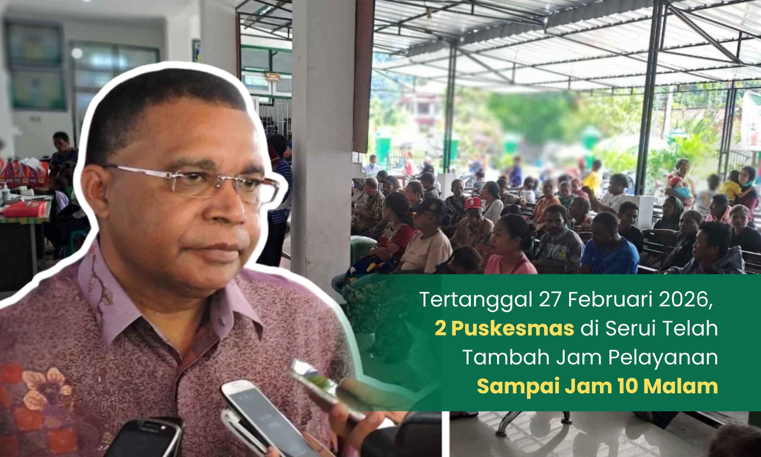 Dua puskesmas di Kota Serui, yakni Puskesmas Serui Kota dan Puskesmas Warari, kini telah menambah jam pelayanan hingga pukul 22.00 WIT. Kebijakan ini mulai diberlakukan sejak 27 Februari 2026, sebagai bagian dari upaya meningkatkan akses pelayanan kesehatan bagi masyarakat.