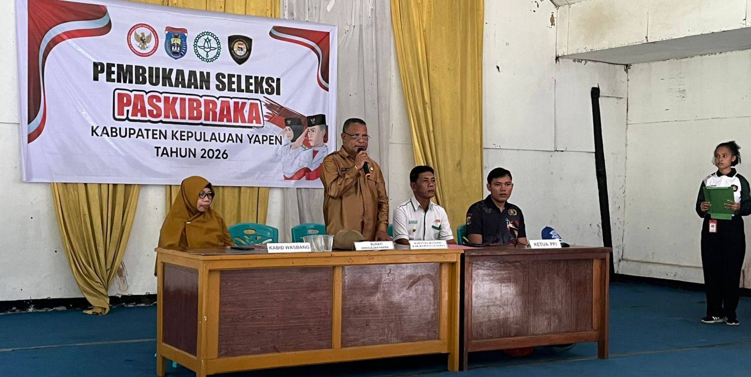 Serui Pos – Pemerintah Kabupaten Kepulauan Yapen, Papua, melalui Badan Kesatuan Bangsa dan Politik (Kesbangpol) resmi membuka seleksi Pasukan Pengibar Bendera Pusaka (Paskibraka) tingkat kabupaten tahun 2026. Kegiatan tersebut digelar pada Selasa (10/3/2026) di Gedung KNPI Serui.