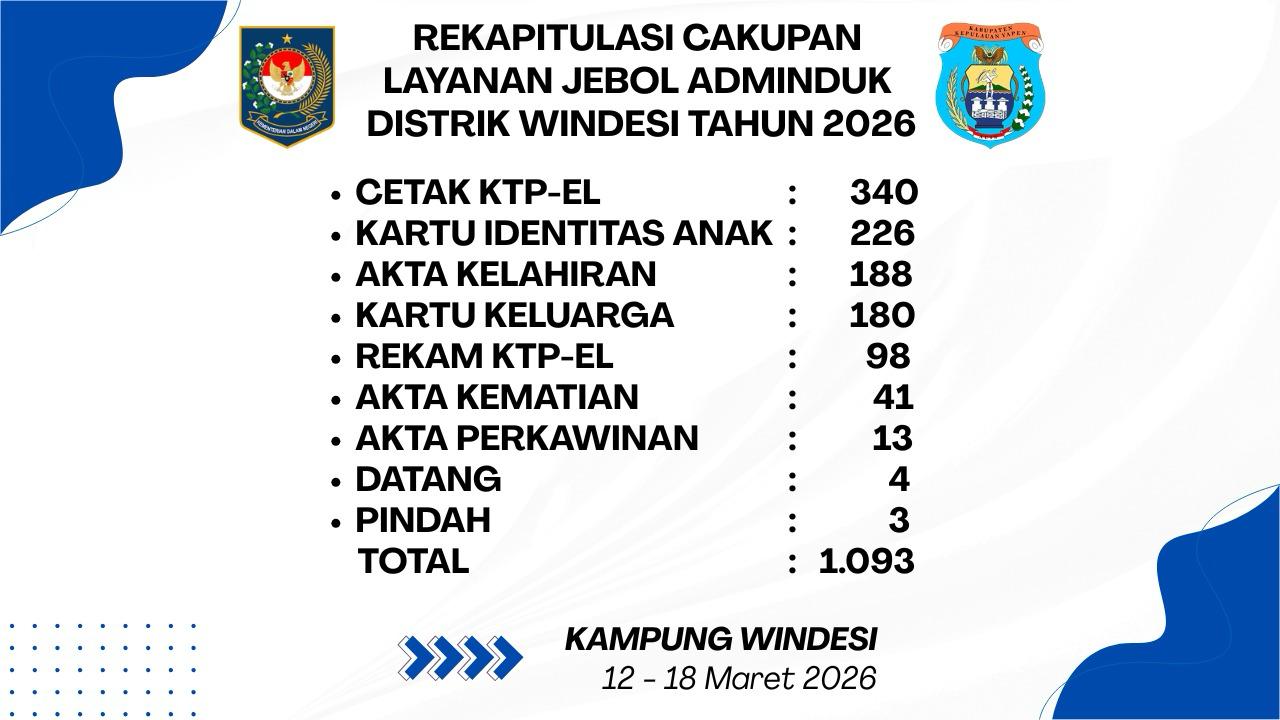 Sementara itu, pelayanan di Distrik Windesi yang dipusatkan di Kampung Windesi pada 12–18 Maret 2026 berhasil memberikan layanan sebanyak 1.093 dokumen.