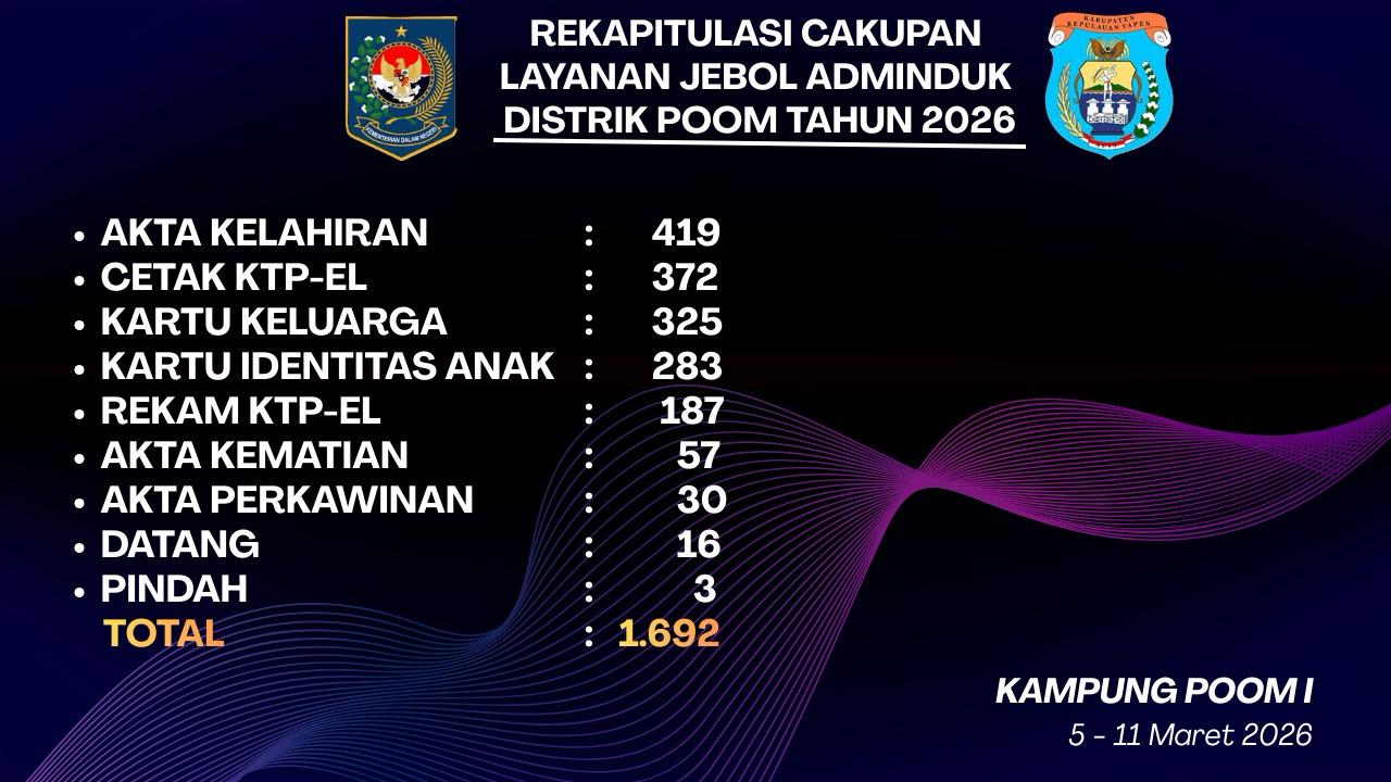 Di Distrik Poom, pelayanan dipusatkan di Kampung Poom I pada 5–11 Maret 2026. Selama kegiatan berlangsung, total layanan administrasi kependudukan yang berhasil diberikan mencapai 1.692 dokumen.