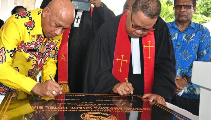 SERUIPOS.COM | Bupati Biak Numfor, Markus Octovianus Mansnembra, bersama Ketua BP AM Sinode GKI di Tanah Papua, Andrikus Mofu, meresmikan Gedung Mess GKI atau Amazing Grace Hotel Biak, Jumat (24/04/2026).