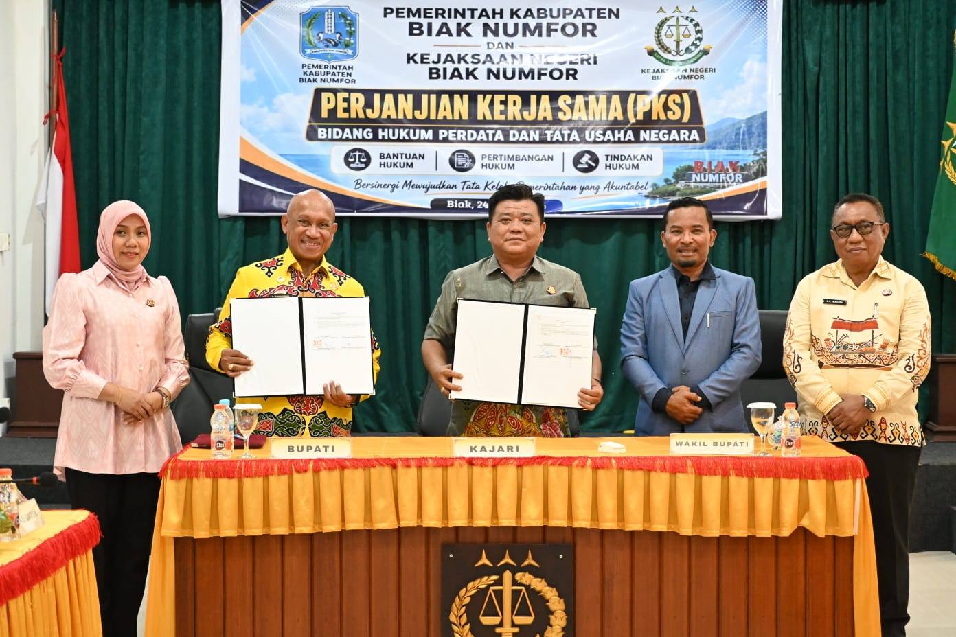 SERUIPOS.COM | Pemerintah Kabupaten Biak Numfor memperkuat kerja sama dengan Kejaksaan Negeri Biak melalui penandatanganan nota kesepahaman (MoU) di bidang Hukum Perdata dan Tata Usaha Negara (TUN), Jumat (24/4/2026) kemarin.
